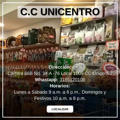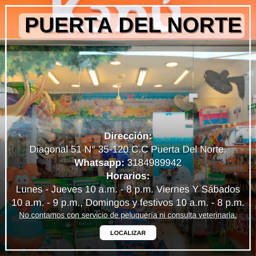 ¡Te invitamos a conocer nuestras 15 tiendas de mascotas ubicadas en Medellín y Bogotá! Con más de 25 años de experiencia cuidando a quien más amas, tu mascota, ofrecemos una amplia variedad de productos exclusivos, alimentación de alta calidad, accesorios, snacks, y medicamentos. Además, contamos con personal capacitado para brindarte la mejor atención, junto con servicios de peluquería, consulta veterinaria y asesoría en nutrición. No dudes en visitarnos o ponerte en contacto con nosotros para darle a tu mascota el cuidado que merece. ¡Te esperamos!