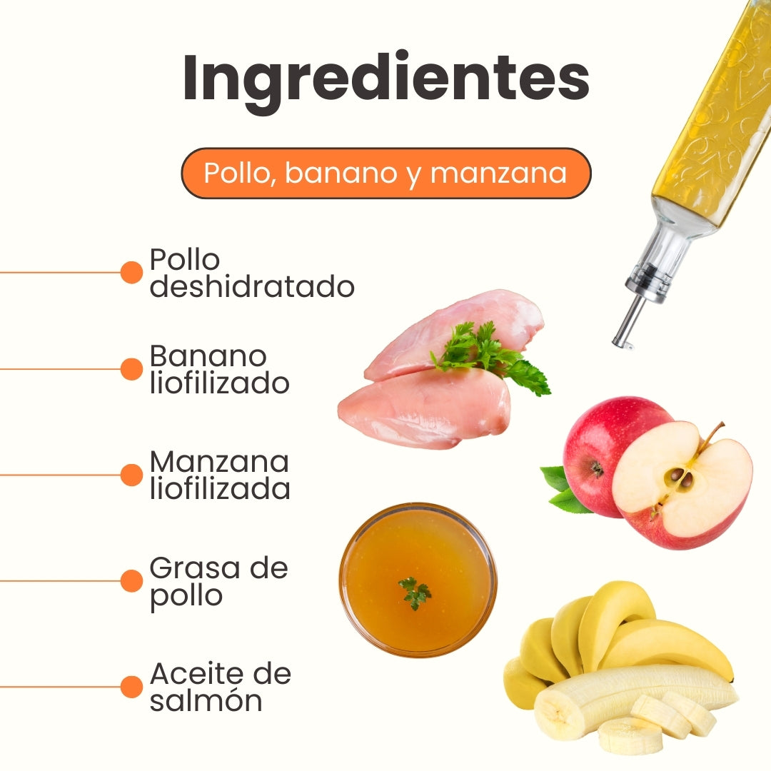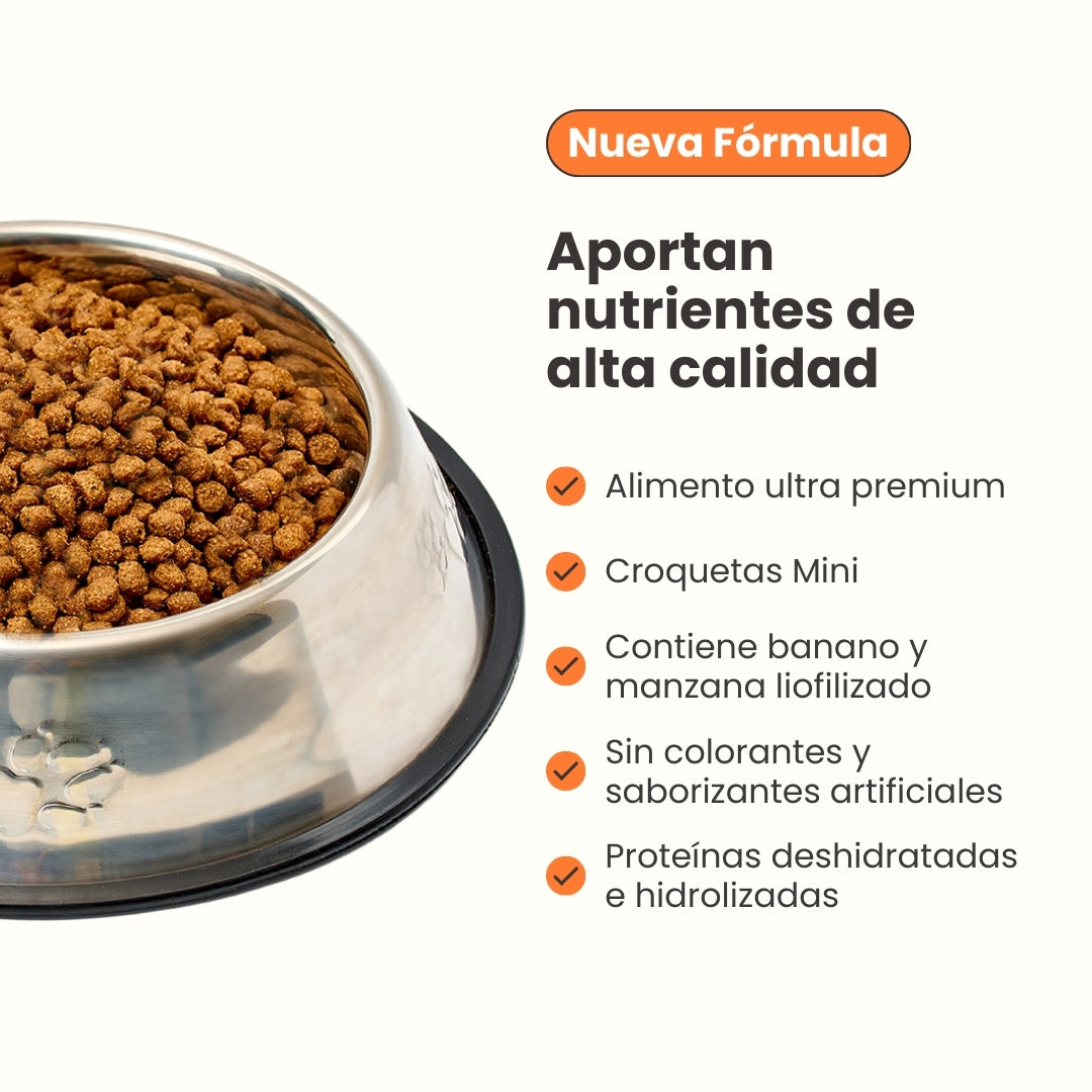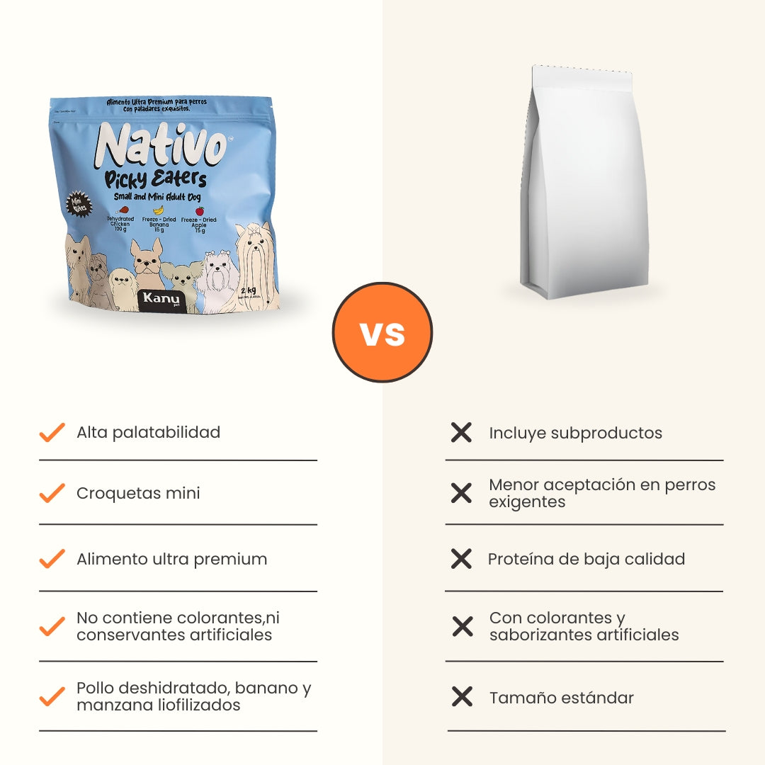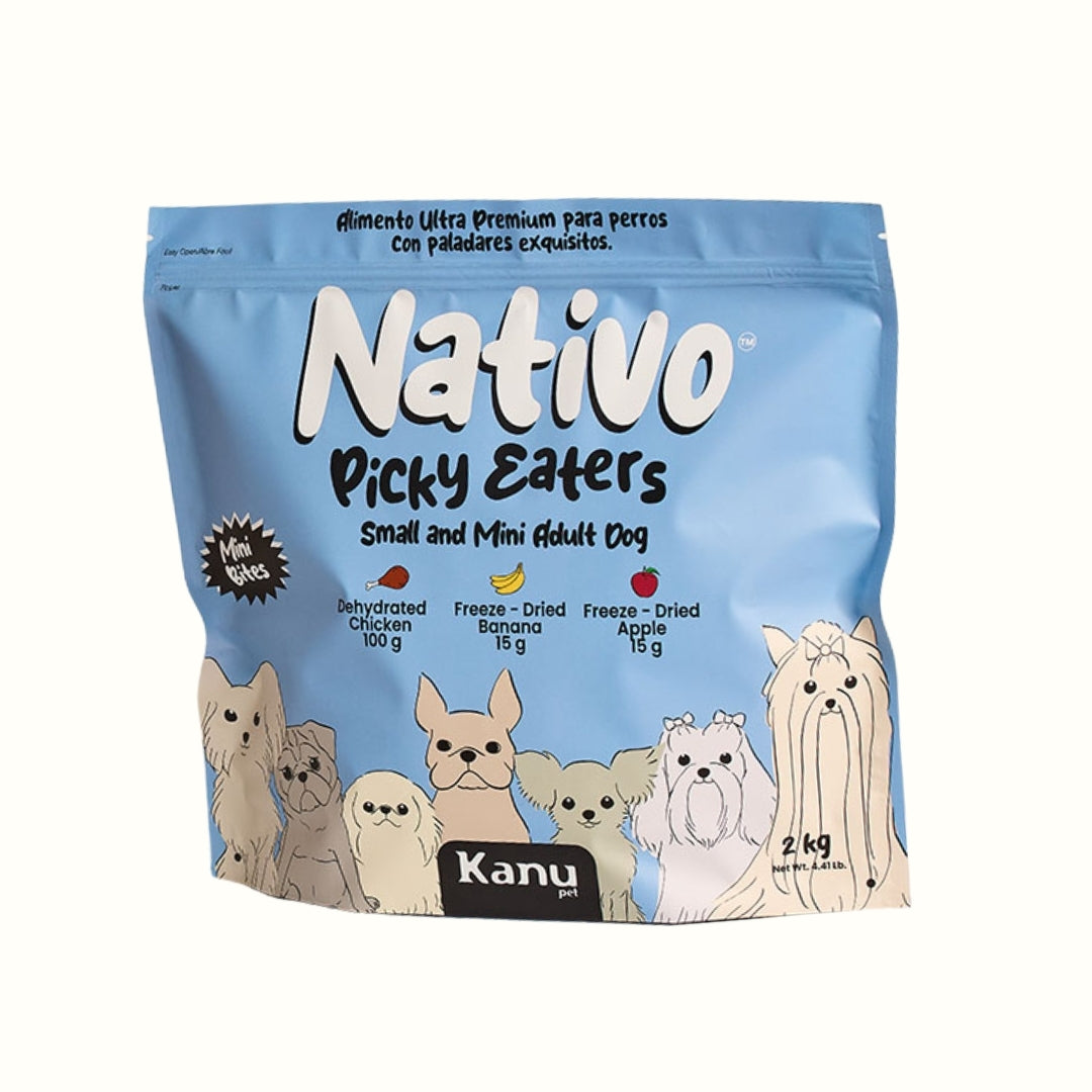 Nativo Picky Eaters de Kanu Pet es un alimento ultra premium para adultos de razas pequeñas y miniatura, ideal para paladares exigentes. Elaborado con pollo deshidratado, banano y manzana liofilizados, ofrece una nutrición balanceada, sin gluten, saborizantes ni sal, Combinación de fruta y carne magra que lo hace irresistible!