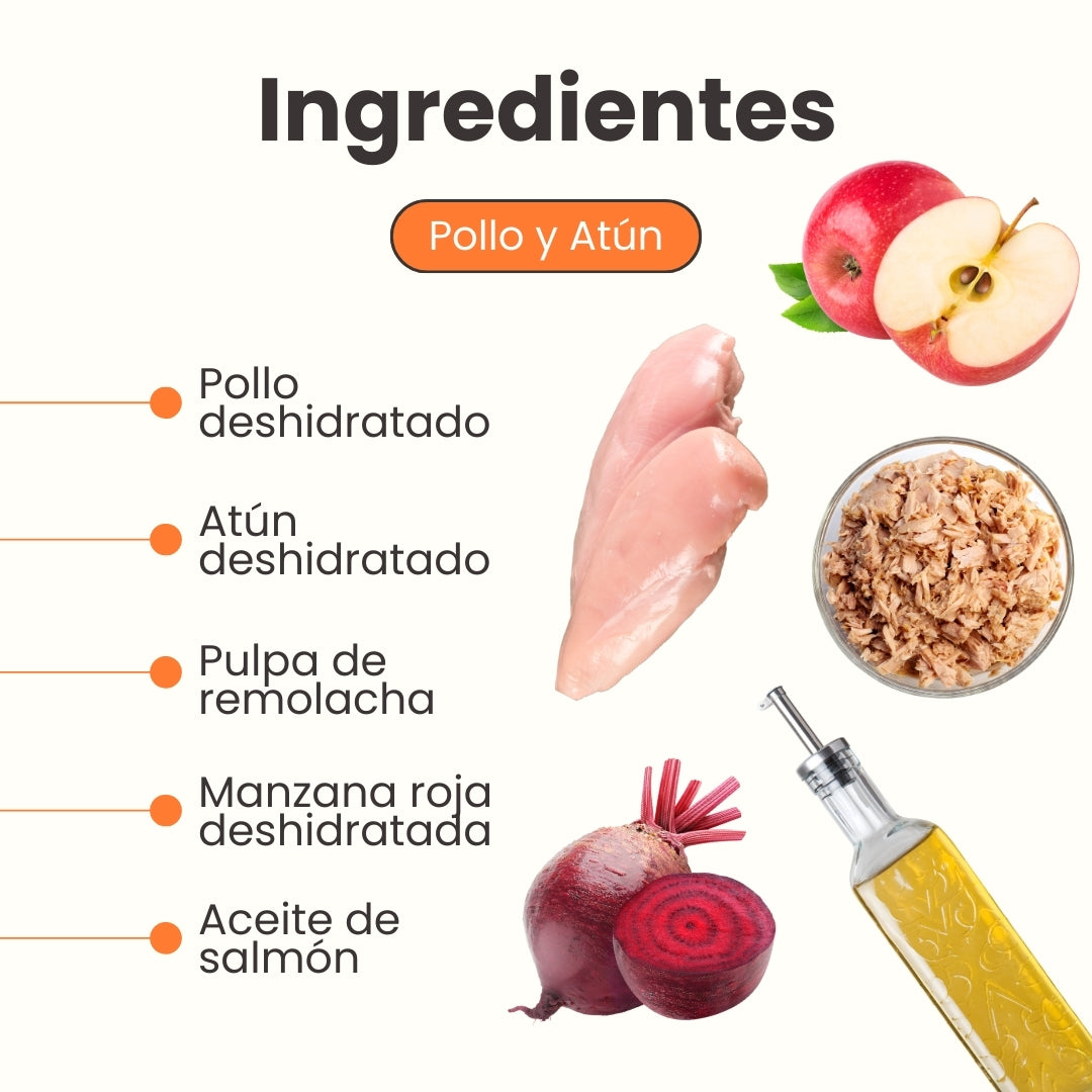 Proteínas de pollo deshidratadas, arroz, trigo, guisantes, grasa de pollo, proteínas de pollo hidrolizadas, pulpa de remolacha, semilla de lino, aceite de salmón, sustancias minerales, huevo deshidratado, proteínas de pescado deshidratadas (Atún), levadura de cerveza, hierbas y frutas deshidratadas ( camelia sinensis, cinnamomium cassia, thymus vulgaris, cúrcuma cedonia, vitis vinífera, melissa officinalis, citrus limoni), saccharomyces cerevisiae, sulfato de cobre pentahidratado, sulfato de hierro monohidratado, sulfato manganoso monohidratado, yodato de calcio anhidro, óxido de zinc, selenito de sodio, vitamina A, vitamina D3 y vitamina E.