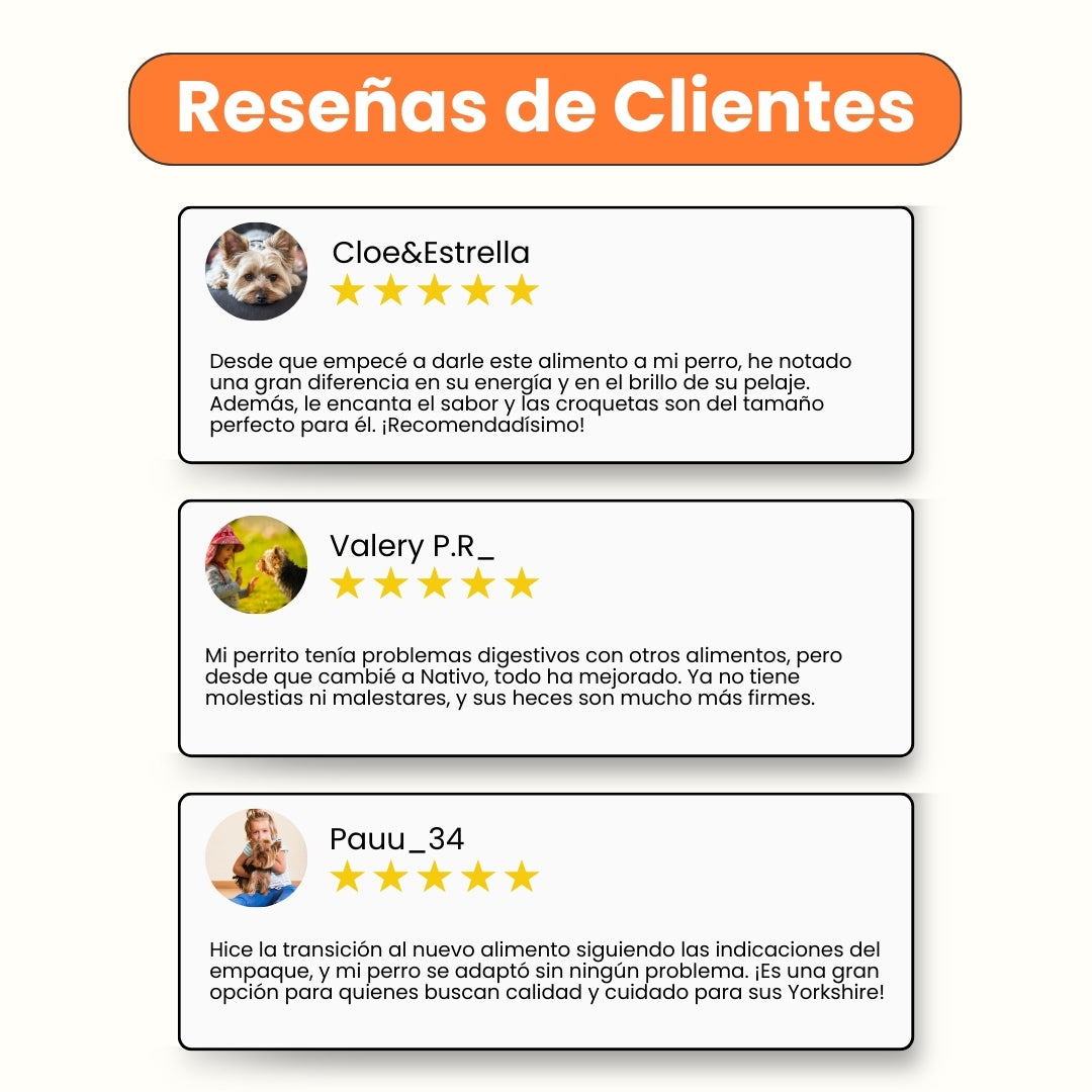 Nativo Yorkshire Terrier Adulto es un alimento formulado especialmente para cubrir las necesidades nutricionales de esta raza. Sus croquetas mini, adaptadas al tamaño de su mandíbula, favorecen una digestión saludable, un pelaje brillante y un sistema inmunológico fuerte.